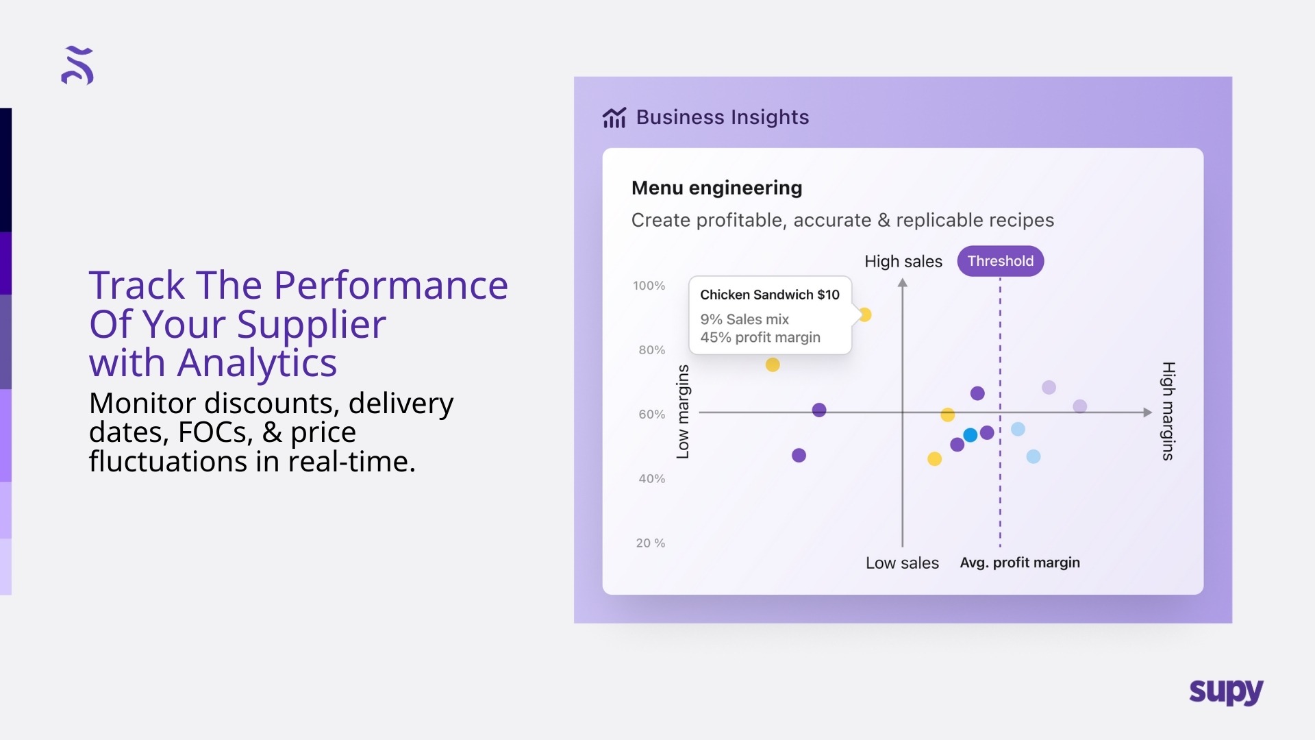 This is why opting for a specialized back-of-house software can be a game-changer to your business. Software like Supy provides you with not just the digital tool to input data accurately and regularly, but to also track your costs in real time using built-in dashboards.