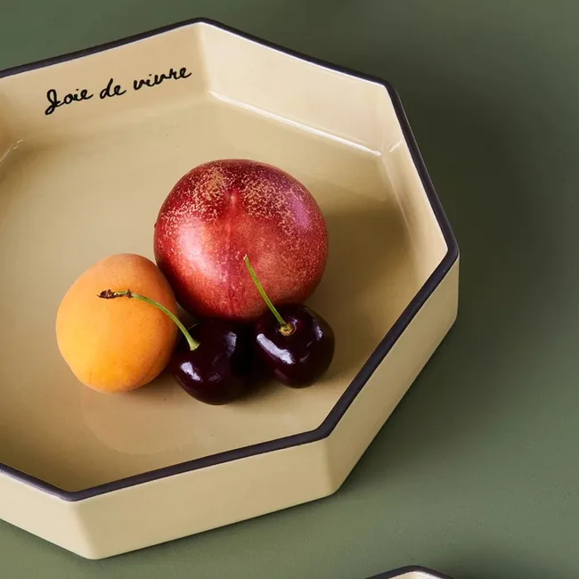 In true French Style, this fruit or serving bowl is understated and elegant. The butter yellow colour—one of the most popular hues to emerge in 2025—with navy trim is given that extra pop by the “joie de vivre” subtly inscribed on its interior. If you don’t like this piece, check out more of the range from Black Blaze—an affordable but stylish homewares range, full of statement tablewear and decor at affordable prices.