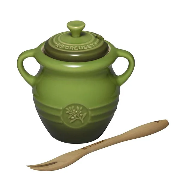 An adorable gift for the friend who loves to entertain, this green ceramic olive jar comes with it’s own fork to avoid fingers dipping in to the olive bowl.
