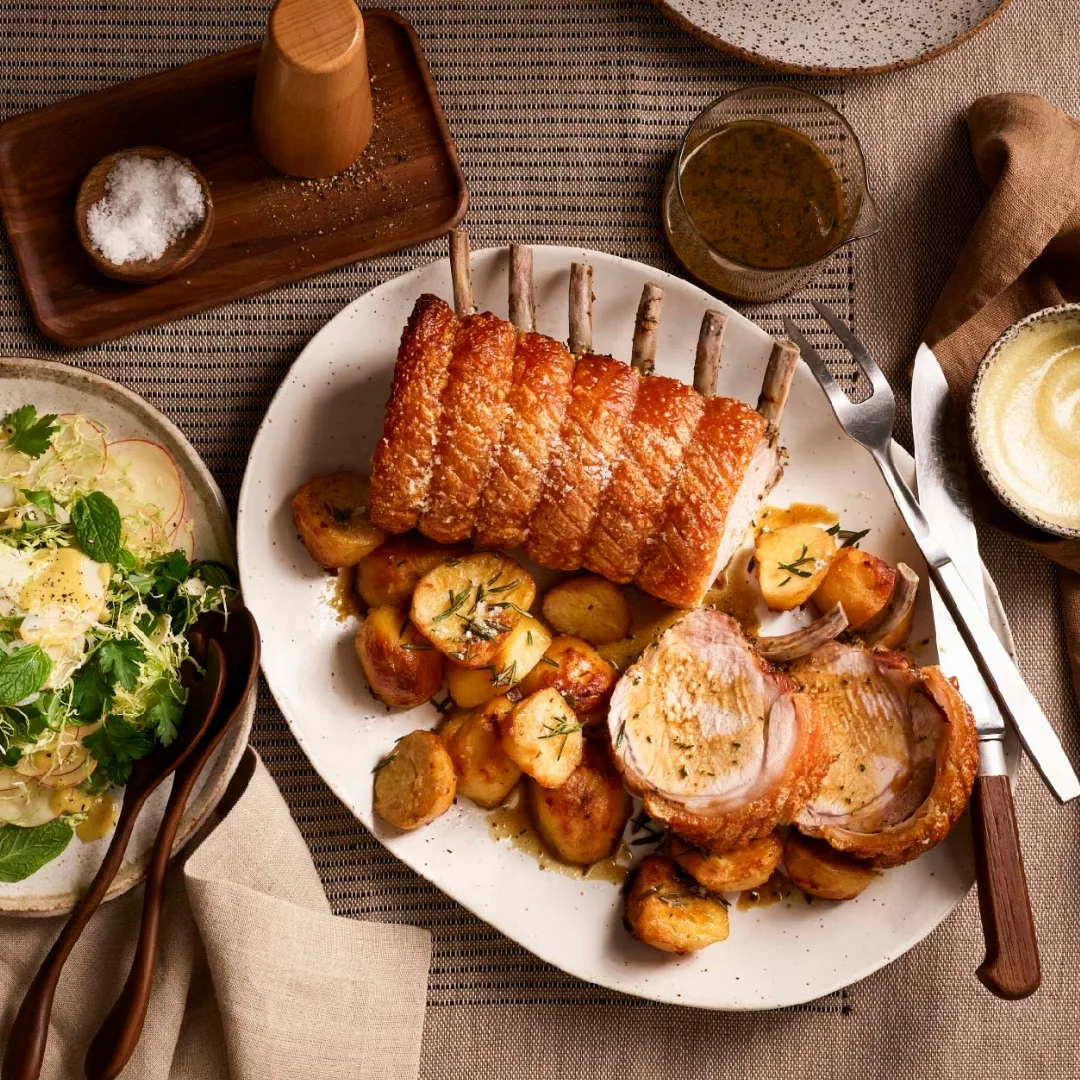 Arrange pork on a large serving platter with roast potatoes. Serve with spiced apple sauce and apple-Brussels sprout salad on the side.