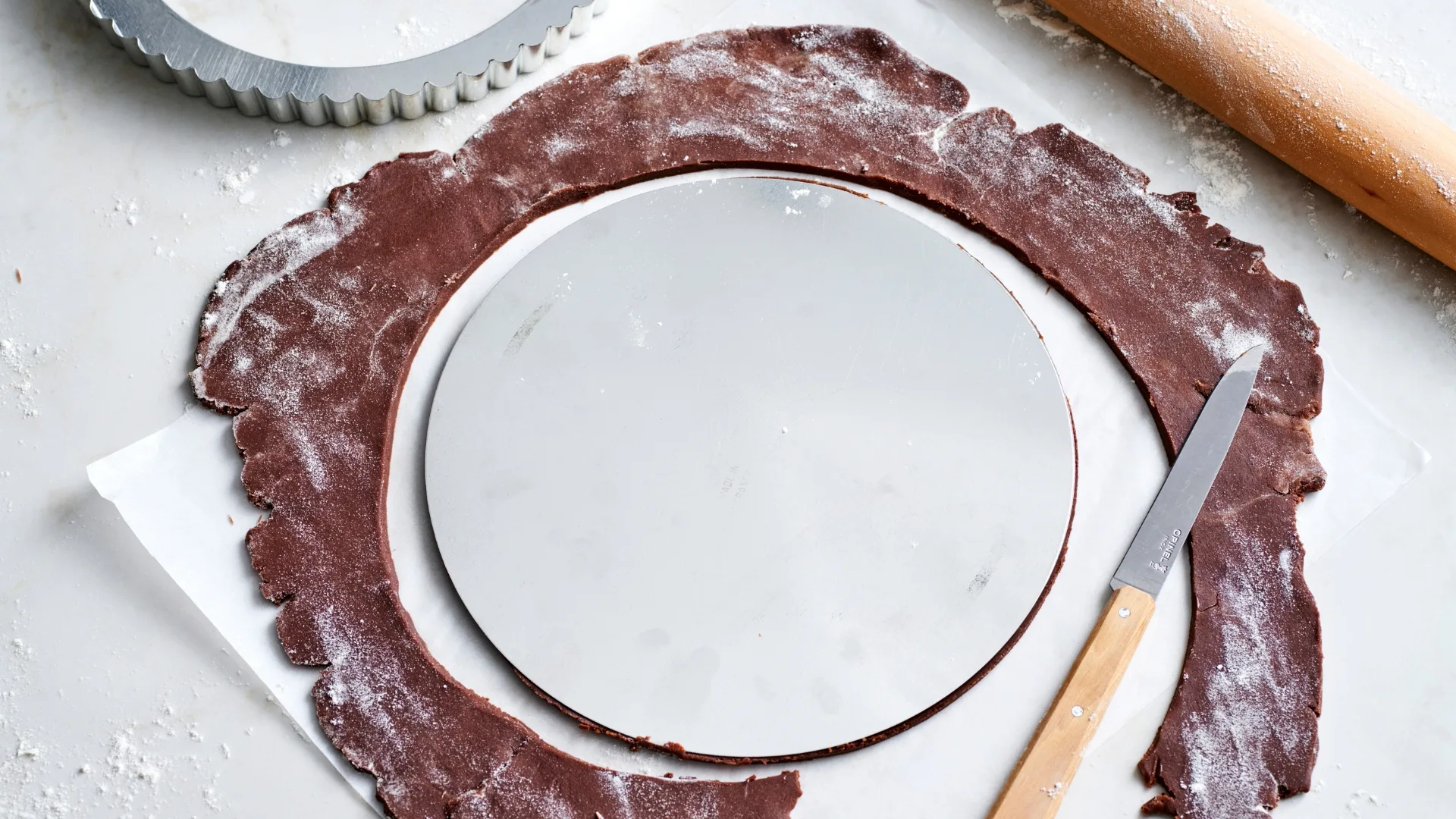 For chocolate pastry, sift flour, cocoa and a pinch of salt into a bowl to combine and set aside. Beat butter and sugar in an electric mixer on high speed until light and creamy (7-8 minutes). Reduce speed to medium; add egg yolk and beat to combine. Reduce speed to low; add flour mixture and beat until pastry just comes together (don’t overwork). Tip onto a lightly floured surface and gently knead until smooth. Shape into a disc and wrap in plastic wrap. Refrigerate to rest (1 hour).