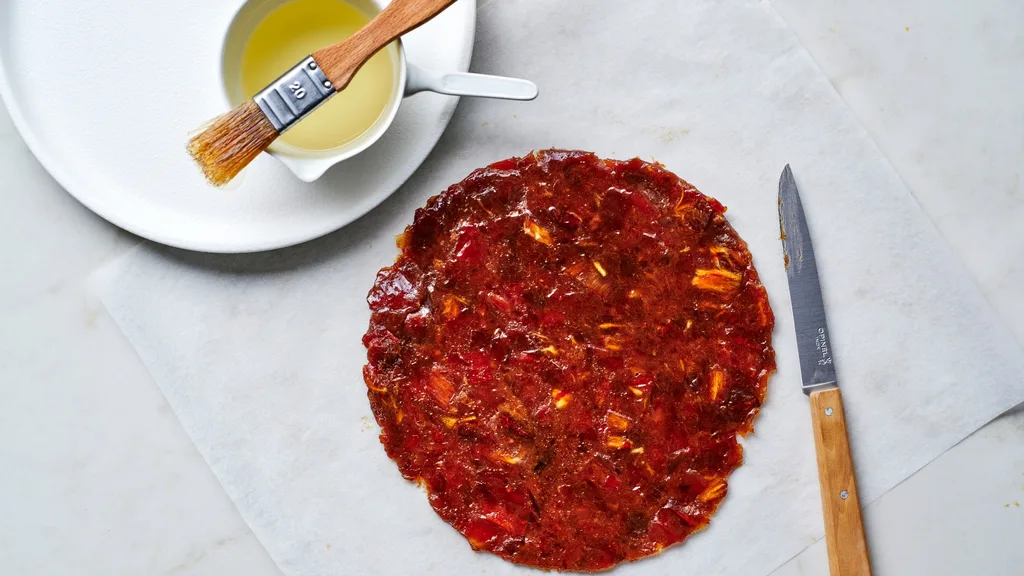 With oiled hands, roll date paste into a ball. Cut two 25cm square pieces of baking paper. Place one piece of baking paper on a work surface, lightly brush with oil, then place ball of date paste in centre. Lightly grease remaining piece of baking paper with oil, place greased side down on top and roll out to a 22cm rough round. Remove top sheet of baking paper. Using a 20cm-diameter flat plate or base of cake tin, trim to a round. Invert into base of tart tin, then remove remaining sheet of baking paper. Set aside.