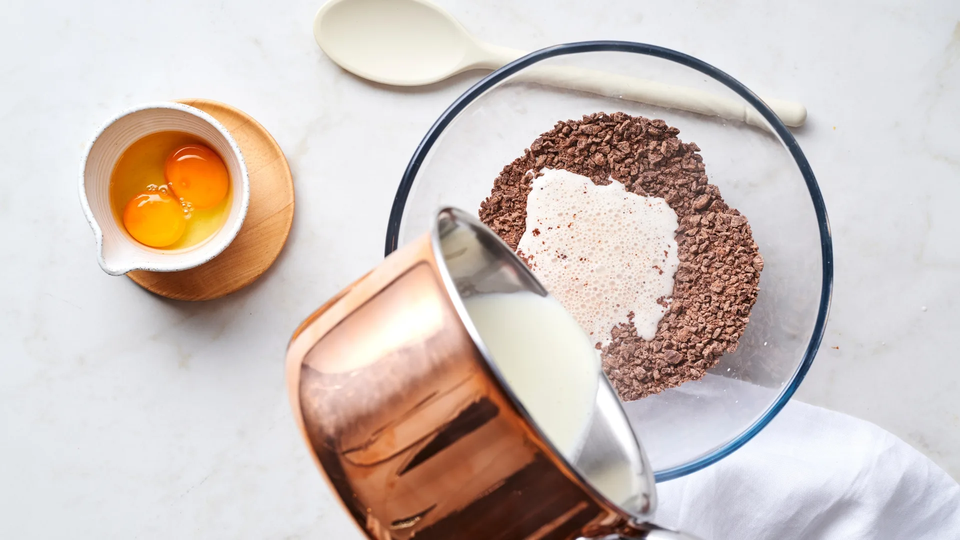 Reduce heat to 110°C fan-forced. For chocolate filling, place chocolate in a heatproof bowl; set aside. Whisk egg and egg yolk in a bowl until smooth, then strain into a separate bowl; set aside. Place cream, milk and pinch of salt in a saucepan and bring to a simmer. Pour over chocolate and stand until chocolate melts (2 minutes). Stir gently with a spatula until smooth and combined. Add egg mixture and stir until smooth and glossy.