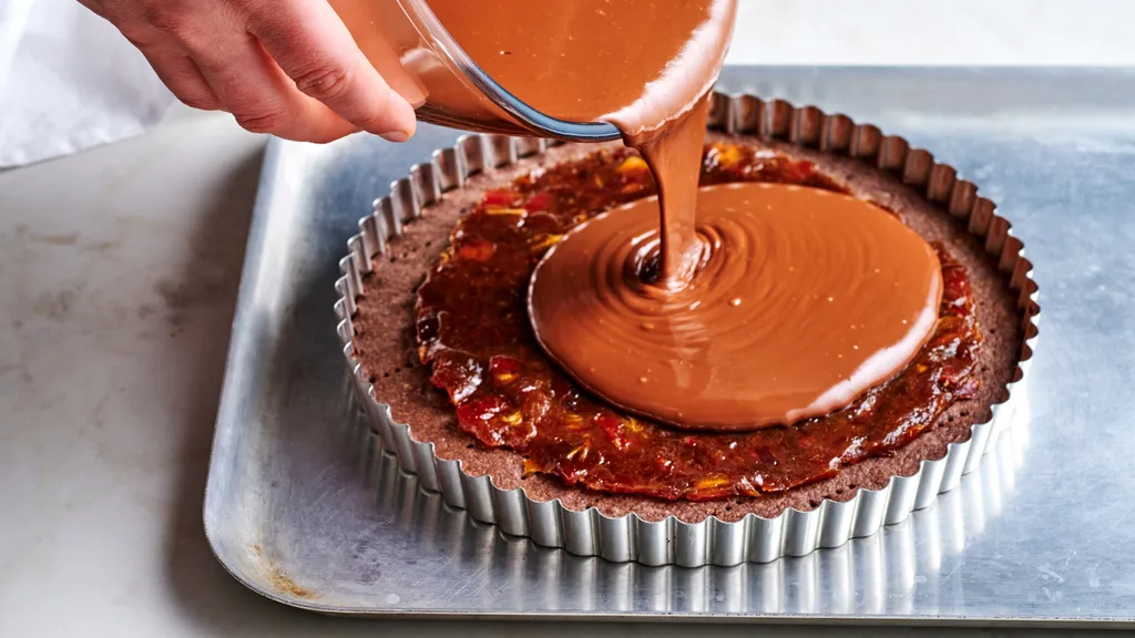 Pour chocolate filling into tart tin. Gently tap tin on bench to remove large air bubbles that form on the surface. Transfer to oven and bake until almost set with a slight wobble in centre (30-35 minutes). Stand at room temperature to completely set (4-5 hours).