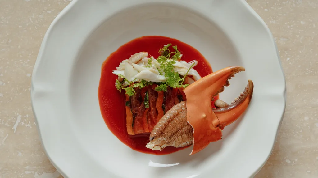But stealing the show is a vivid crab claw-topped tomato and red pepper terrine, using wild celery seeds picked at the nearby Adelaide Botanic Garden to make a vinegar that delivers floral notes.