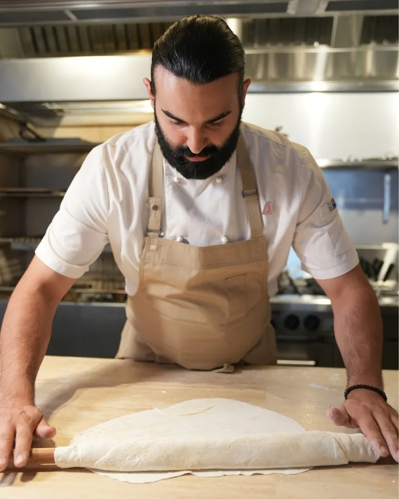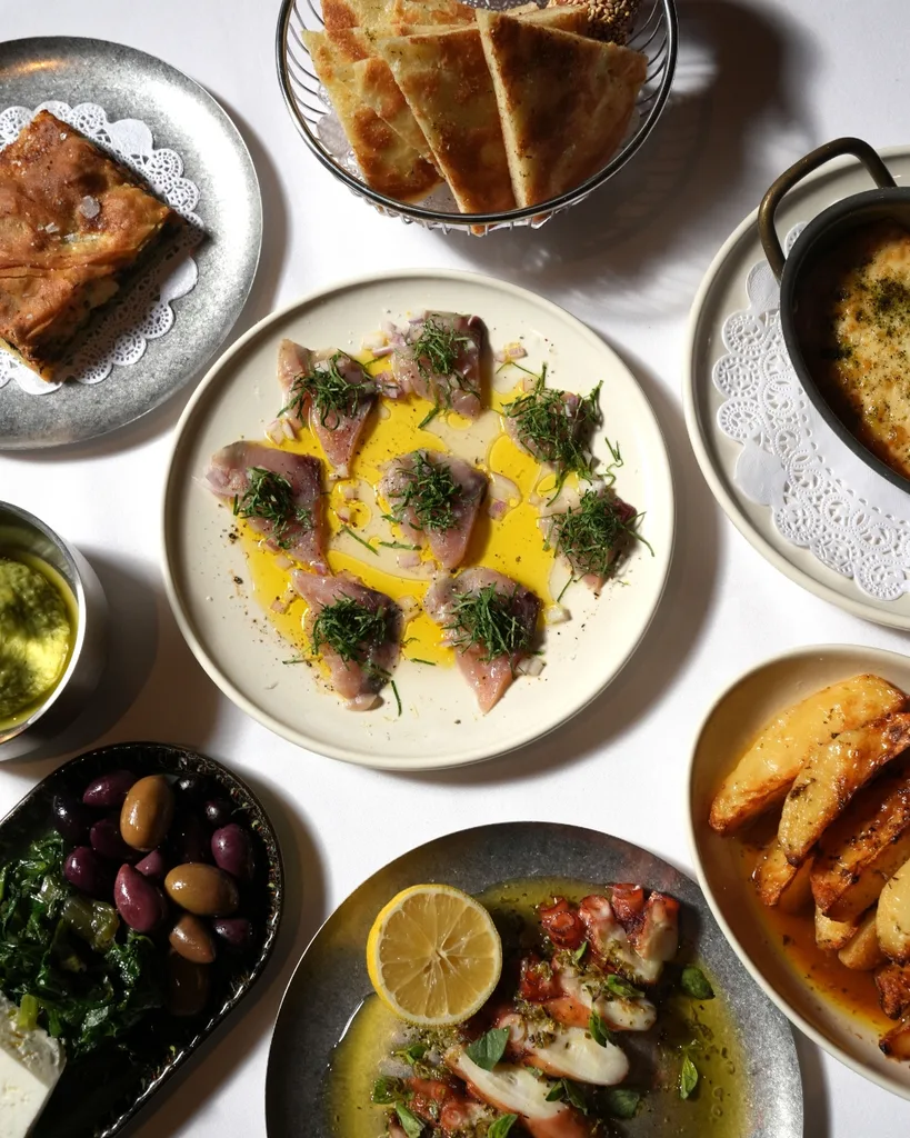Inside, the atmosphere is similarly up-tempo; bear hugs and warm welcomes between friends. A cobalt door, blue as the Mediterranean Sea, leads the way through a bright, open-plan space designed by Studio Gram, who also applied aesthetic nous to owner Simon Kardachi’s Osteria Oggi, Fugazzi and Latteria. At Omada, they embraced a soothing, “less is more” Greek classicism aesthetic. The large dining room is bookended by an open-plan kitchen and a long, narrow marble bar which turns out to be a leading character in its own right.