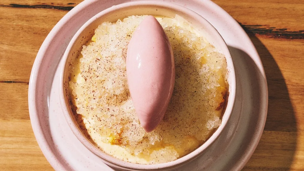 May we suggest, with gentle urgency, that you don’t leave Watermans – the new Barangaroo venue from the hospitality duo behind Bentley Restaurant + Bar, Eleven Barrack and King Clarence – without ordering dessert. The sheep’s yoghurt parfait with its sunset-peach sorbet topper, especially. There are gold nuggets of honeycomb in the middle, a dusting of scarlet sumac on the top, and it’s a joyous blend of sweet, sour and tang. Actually, get two desserts. You also need the brik bougatsa – a Greek pastry slice filled with crème pâtissière and cherry jam, with a powerful, headily fragrant aniseed sorbet on the side, kind of like ouzo ice-cream.Â