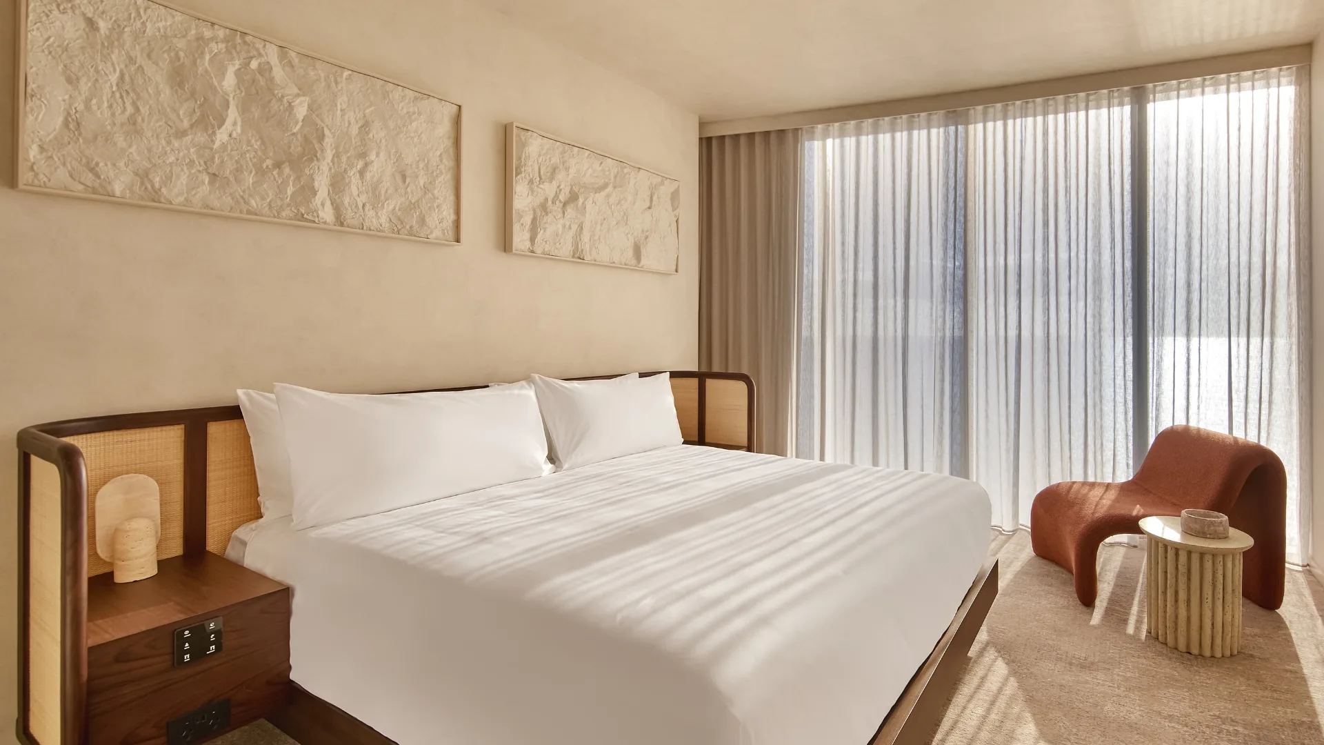 Each spacious room is washed in neutral grey, creating an ideal contrast for the main attraction: the million-dollar views of the Pacific Ocean, Burleigh Headland or the hinterland framed by floor-to-ceiling windows. A small balcony allows you to take it all in, even from the plump king bed, thanks to automatic blinds. A jungle-print sofa and rust bouclé accents bring the fun, Le Labo Santal 33 amenities deliver chic indulgence, and the in-room beach bag and long linen robe are ideal for taking poolside. Opt for a suite, and the added kitchenette and laundry will guarantee a more flexible stay.